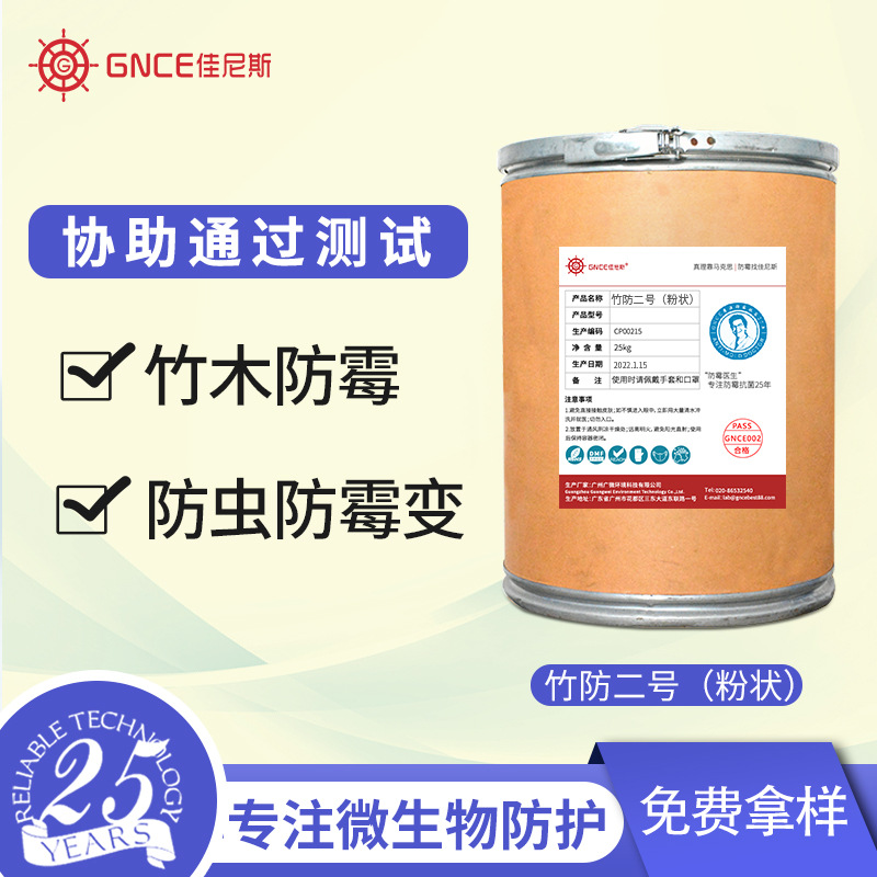 竹防二号主要用于竹材、木材的防霉,可为制品提供良好且持久的防霉性能。竹防二号是一种高效、广谱、耐热 的防霉剂,其化学性能稳定,不含重金属,符合欧盟 RoHS 指令要求,适用于各种竹木制品。
