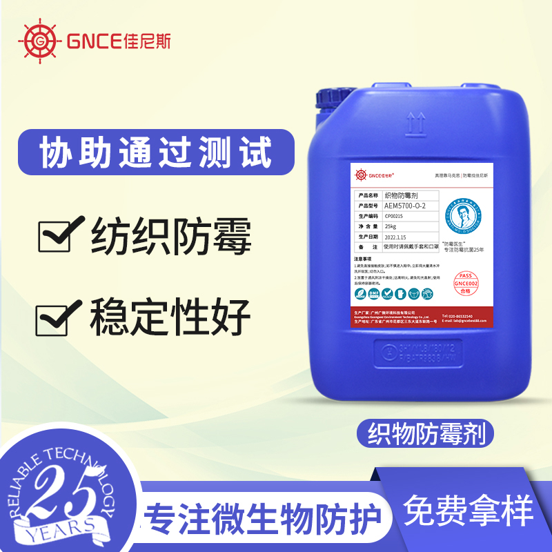 纺织防霉剂 AEM 5700-O-2 用于纺织物防霉加工处理,可使被处理后的纺织品具有优越的防霉性能。可以防止微 生物所引起的危害,避免织物出现发霉,保障产品质量,延长织物的使用寿命。
